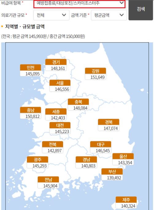 ①예방접종 비용 조회로 들어가서 지역을 선택하고 진료비 항목에 대상포진이라고 적습니다.