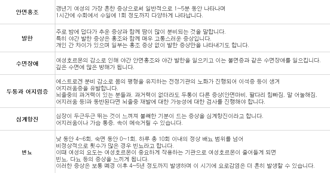 갱년기 증상이 심한 경우에는 의사와의 상담을 통해 호르몬 요법, 약물 요법의 처방을 받아야 합니다.